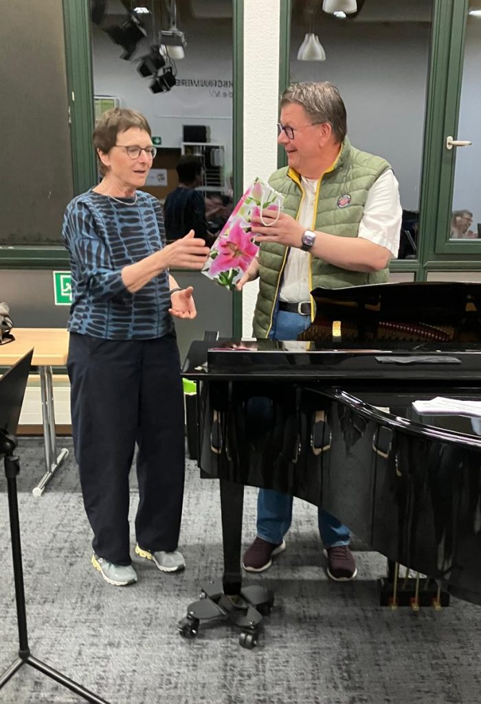 Der Chorleiter Michael Hartel begrüßt am 5. März 2026 das 60. Chormitglied bei den Singing Voices.